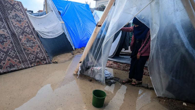 • বৃষ্টির পানি যেন ঘরে প্রবেশ করতে না পারে, এজন্য বৃষ্টির পানি ঠেকানোর চেষ্টা করছেন গাজার এক নারী